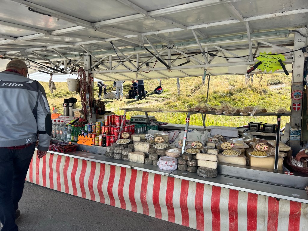 At the top of one mountain pass, we had to stop to both admire the 20 or so other motorbikes (and the same number of less interesting road bikes) as well as investigate the French pastoral version of a service station… a market stall selling chilled drinks, cheese and meats.