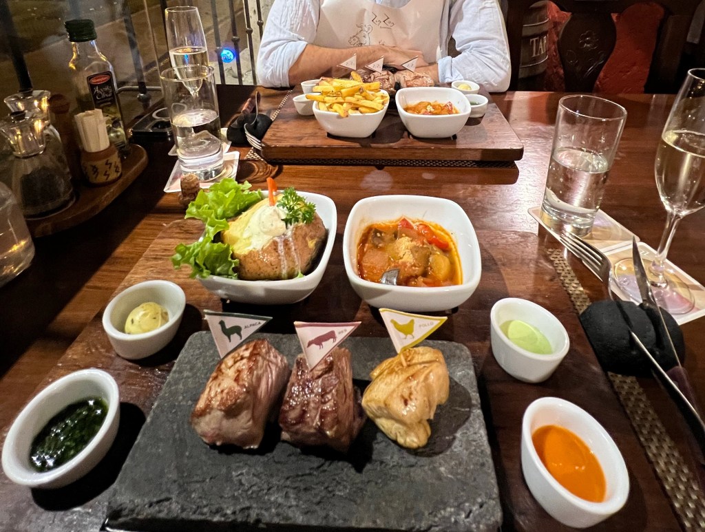 Having dropped off our bags, we went for a wander round, a quick shower and change in our luxuriously huge hotel room, and then headed out to supper at ZigZag. If you were to eat in only one place in Arequipa, this should make your (then short) list. We began with some free dough balls, champagne and fizzy water. Starters