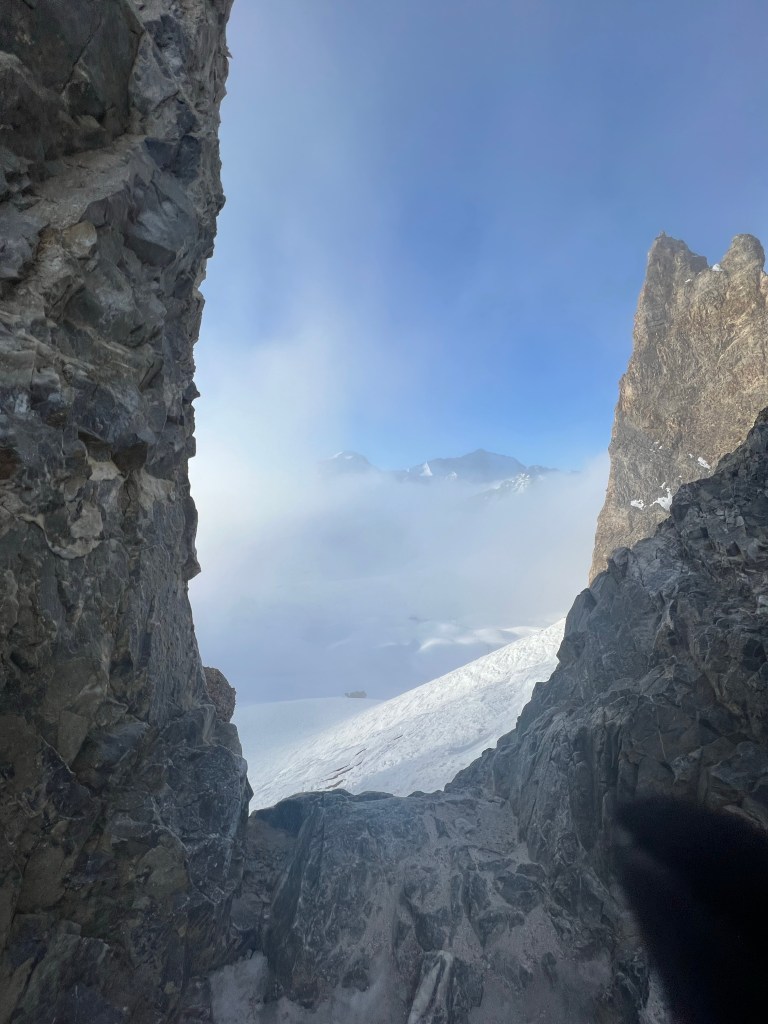 Eliza stopped to enjoy some views as we reached the top of next lift. We got to the eye of the needle (and climbed into it) 1hr in, just as cloud properly descended.