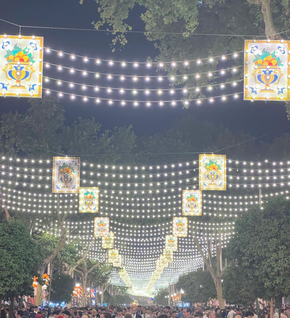 In spite of feeling slightly awkward about our slight state of undress, we settled in quickly, particularly as Martin had family who invited us into their shared caseta. At the Feria, these casetas are tents set up specifically for the week of the festival, and there are hundreds of them. They create an entirely new small village within the bustling metropolis of Seville and the lights attached to all the tents and the rails in the park create a feeling of timelessness – it is no longer possible to tell how far into the night you are, because darkness has never fallen! Most of these casetas are privately owned by families or collections of families, and you can usually only enter if you know the family who owns that particularly caseta. There are however some public ones that are popular too.