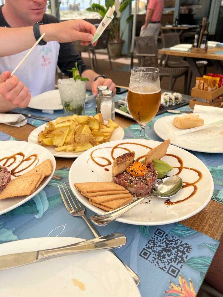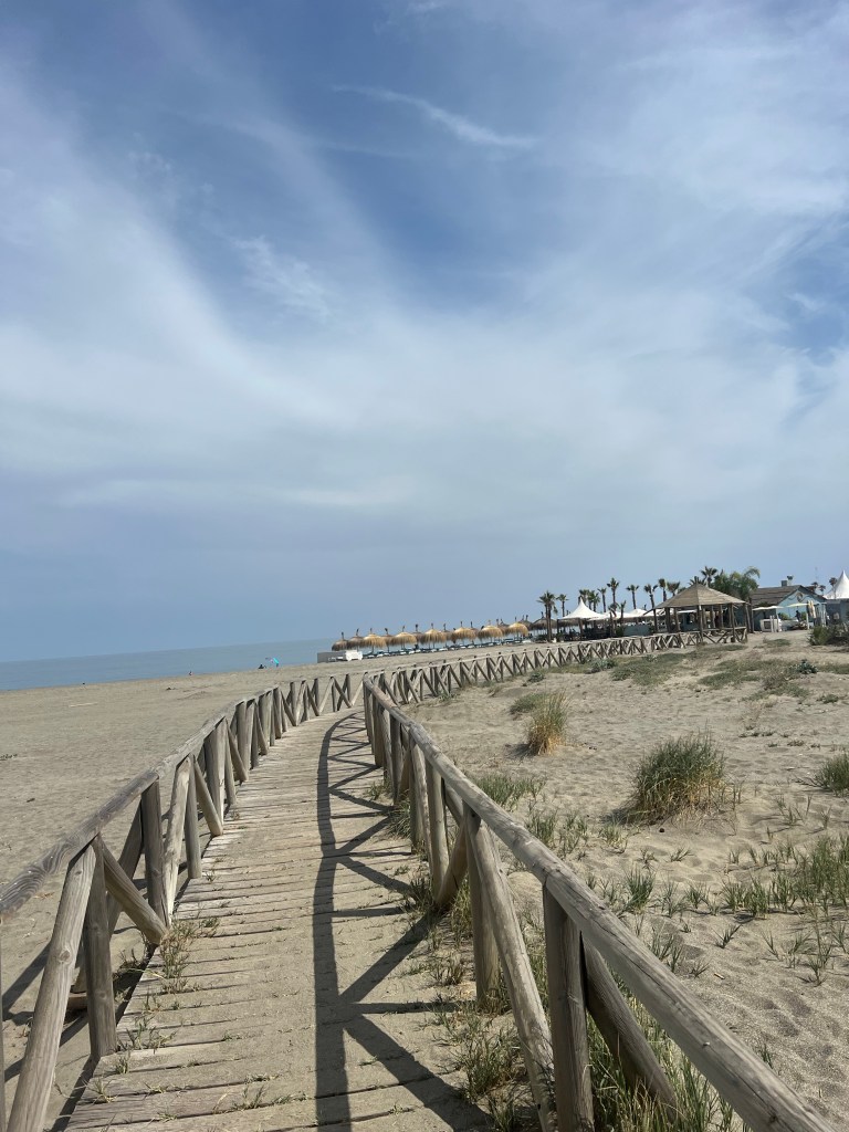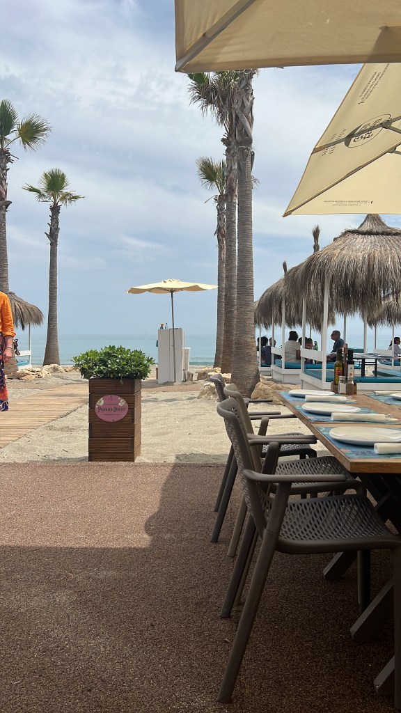 Upon arrival at the tiny beachside town (village?) of San Diego, just past Sotogrande, we called the beach club for lunch. It’s owned by a friend of our Spanish friend, and apparently the owner divides his time between running the beach club in summer and a bar up in the ski resort in Sierra Nevada in winter. Not a bad life set up!