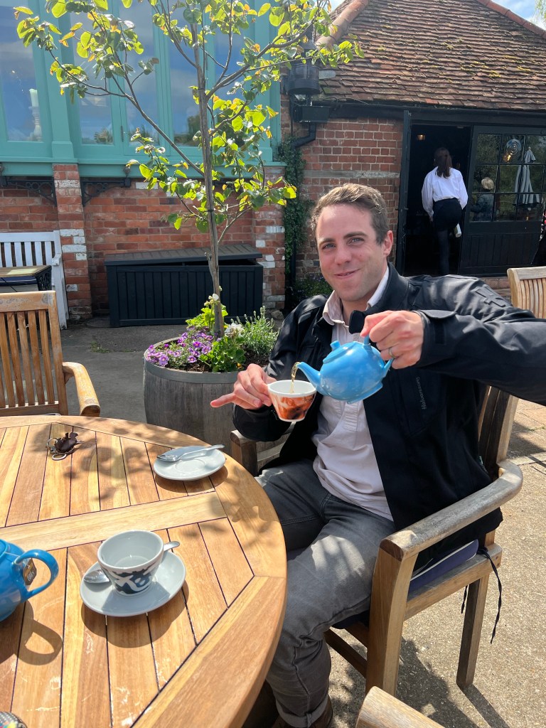 Day 5) Getting motorbike stuff sorted, visiting friends (set #4) in Hampshire, forming a motorbike gang with Tom’s parents and godfather.