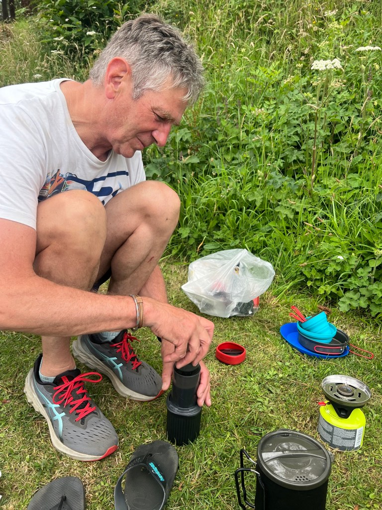 We were joined for our supper under the tarpaulin by a lovely French chap who was walking from his home near Lyon in the South of France to Ireland to visit his girlfriend. He’d endured two days of sleeping in torrential rain with a leaky tent and now his lighter on his stove had given up the ghost. When he asked if we might be able to help, Tom was so chuffed to be able to fetch our flint (and to teach this nice man this new term in English!) and we spent an amiable supper time discussing travelling stories and commiserating about the weather.