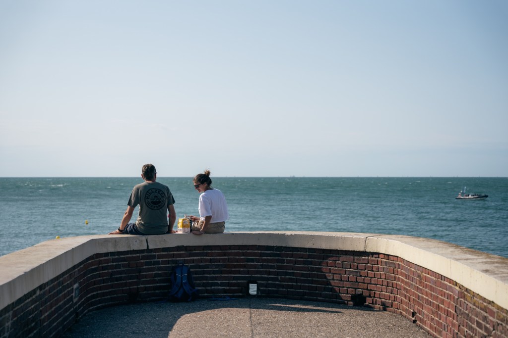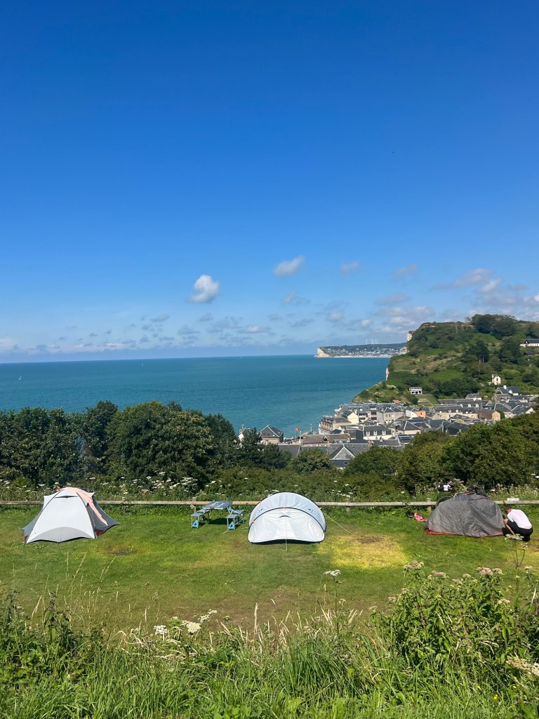 During lunch, we’d looked around on trusty GoogleMaps for campsites for the night, before deciding we may as well come full circle and return to our first campsite where we’d felt so comfortable. Onwards we went, settling back in Yport, and enjoying a packet of crisps and a drink on the beach wall before one more group supper.