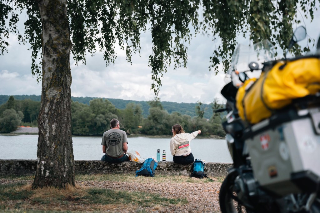 With a feeling of jubilance after this, we stopped for lunch, pausing at a place that we’d earmarked as a potential camping spot for the night. It was, sadly, one of those spots where you arrive and are so unconvinced, you’d rather get back on the bike and push on to somewhere you actually want to be! Nevertheless, we embraced the time for a food stop, taking in the views of the Seine and its constant stream of cargo boats at Arelaune-en-Seine. With happy tummies, we went to get back on the bikes to realise that John had mislaid his keys…