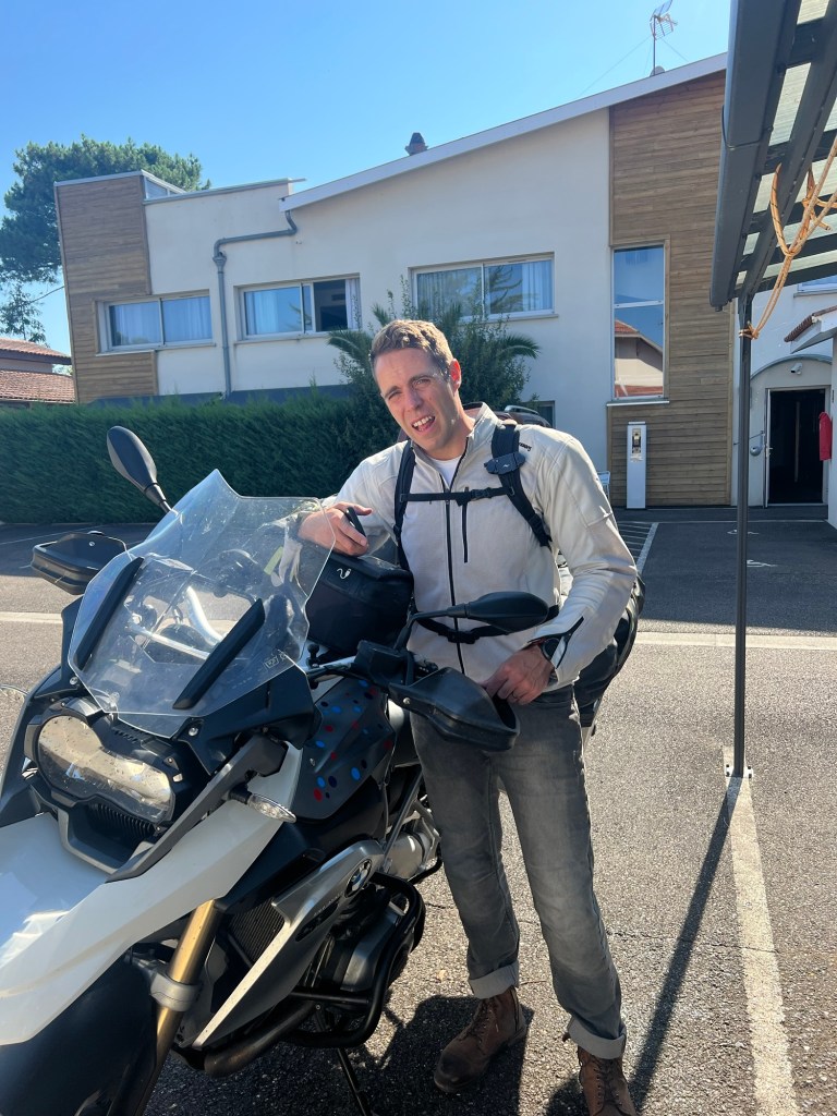 The first section of today’s ride was all good, then it got hotter… and hotter… and hotter. The bike’s thermometer told us it was 37°C as we were going through Bordeaux. When it is full sunshine, nearing 40°C and you are wearing black motorbike jeans, queueing at traffic lights sucks. By the end of the traffic jam through Bordeaux, we were pretty jealous of any car driver who had air conditioning, and Tom became an expert in finding a place to stop in the queue that was in any part shaded.