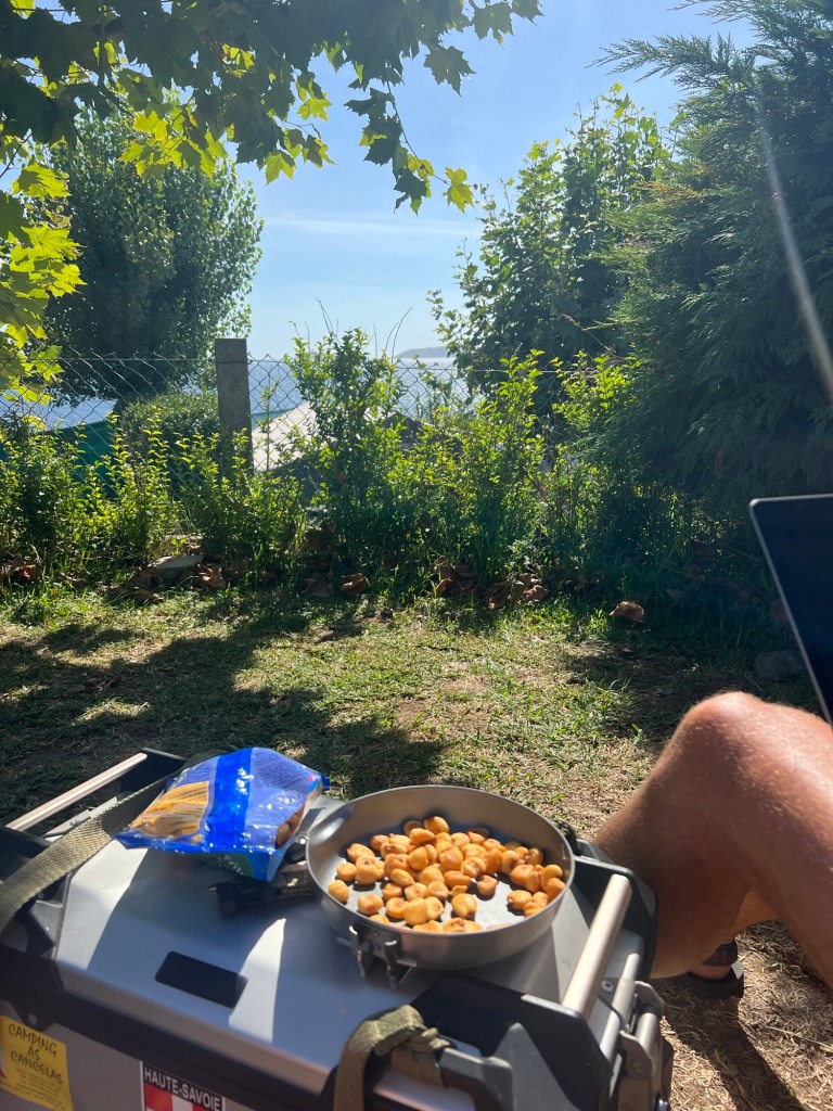 We reached Camping Monte Cabo by early afternoon. It’s a sweet little place clinging to the top of a cliff, clearly designed by someone who believes in sea views, dramatic winds, and not quite enough level ground. The sun was blazing, the wind howled like a moody teenager, and for the first time in a while, we found ourselves with that rare luxury on a road trip: time.