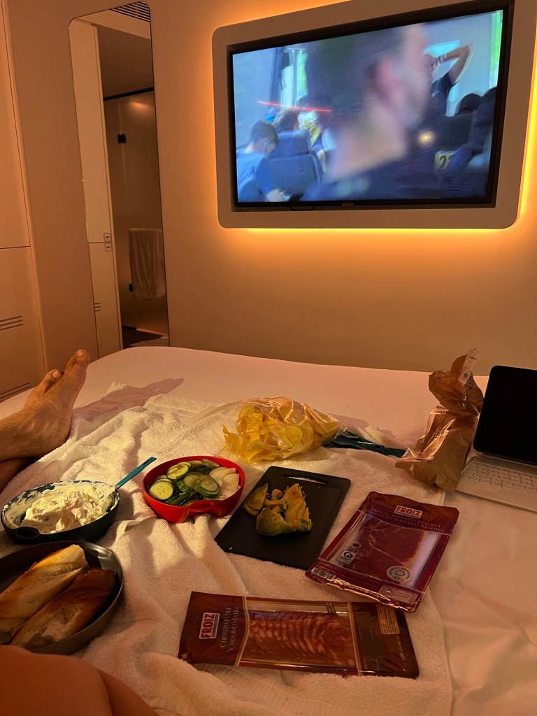 After that little interlude, we returned to our hotel for what we’ve come to call a “picnic dinner,” which is just fancy branding for cold meats and cucumber on the bed while watching the Tour de France on mute and responding to emails. It’s both glamorous and not, in equal measure.